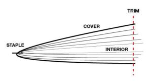 A slight deviation in margin width happens when a large stack of paper is cut simultaneously by a commercial cutting system. This is because the blade cutting into the paper shifts the paper edges slightly as it comes down. While the deviation is usually less than a millimeter, it is crucial to consider when designing. Cutter pull is one of the main reasons it’s rare to see borders or edging art right at the margins: it could be unintentionally cut during trimming.